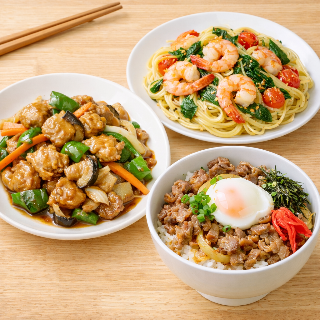 例えば、野菜炒めは好きな野菜と肉を切って炒め、塩やしょうゆで味付けするだけで完成します。丼ものはご飯の上に具材をのせるだけなので、調理と盛り付けが一度で済みます。パスタもソースを絡めるだけで簡単に作れるため、忙しい日の強い味方になります。